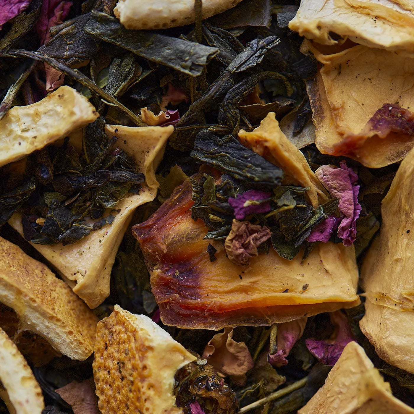 Mesés! papaya szeletekkel, narancshéjjal és rózsaszirmokkal gazdagított zöld és fehér tea. Édes, friss és gyümölcsös jegyekkel.